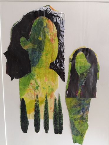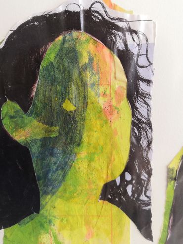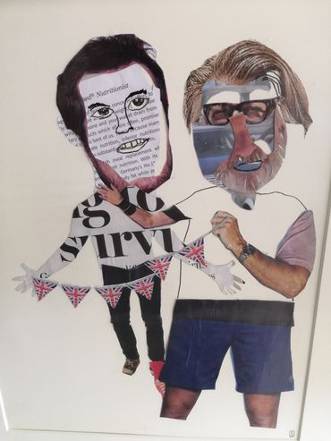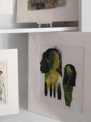 The collages make use of old torn up pieces of work and magazine cuttings – material that is easily accessible and in the house already. Clare always have some material at home for the days when she could work but not quite well enough to go out. Collages are ways of bringing disparate elements together, a reflection of a collaged, mixed up world.
