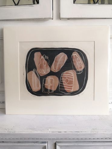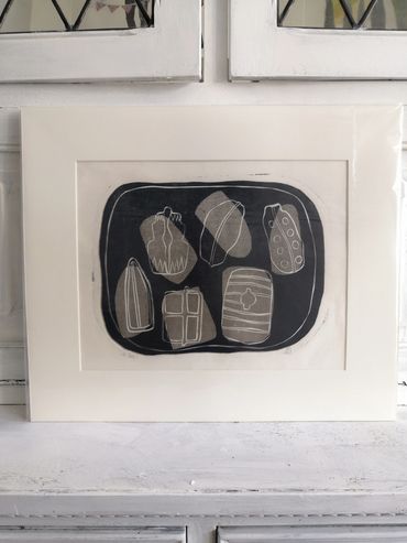 Once Clare felt tentatively able to get back into the studio, which is large and allows for social distancing, she decided to make some monoprints based on ancient Chinese shield shapes. A very direct response to the lockdown experience.